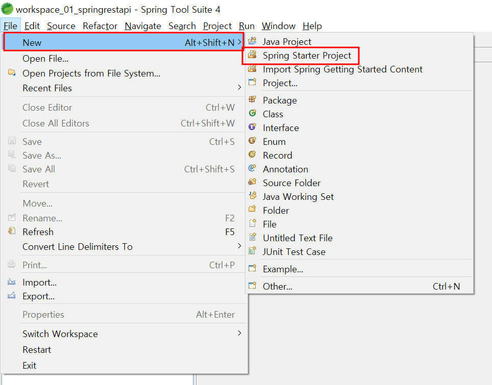 ● 3. STS를 실행합니다. 그리고 이제 프로젝트를 실행해보겠습니다. New에서 "Spring Starter Project"를 실행합니다.