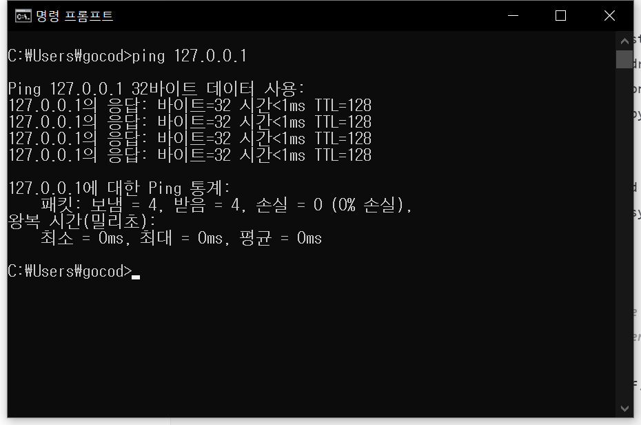 ● 3. 이번엔 명령 프롬프트에서 ping 127.0.0.1을 날려보면 응답이 돌아옵니다. 이것은 인터넷에서 돌아온 게 아닌 내 컴퓨터의 운영체제에서 돌려준 값입니다.