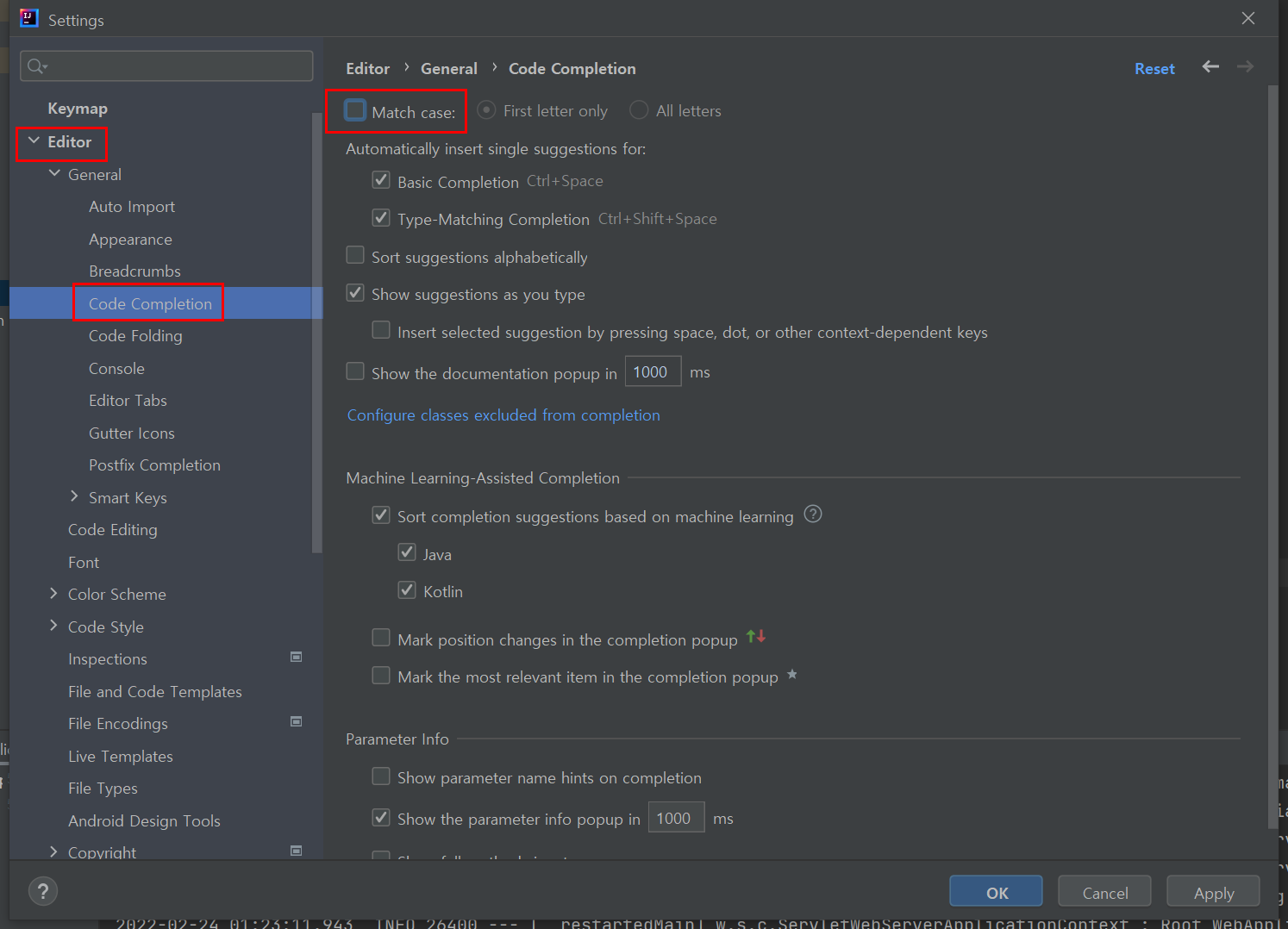 ● 1. 인텔리제이를 쓰다 보면 자동완성이 대문자 소문자를 정확하게 구분하여서 작동됩니다. 그런데 이게 좀 불편합니다. 다행히 해당 설정을 해제하는 방법이 있습니다. 설정에 아래와 같이 Match Case를 체크 해제하면 편안하게 대소문자 구분 없이 자동완성을 사용할 수 있습니다.