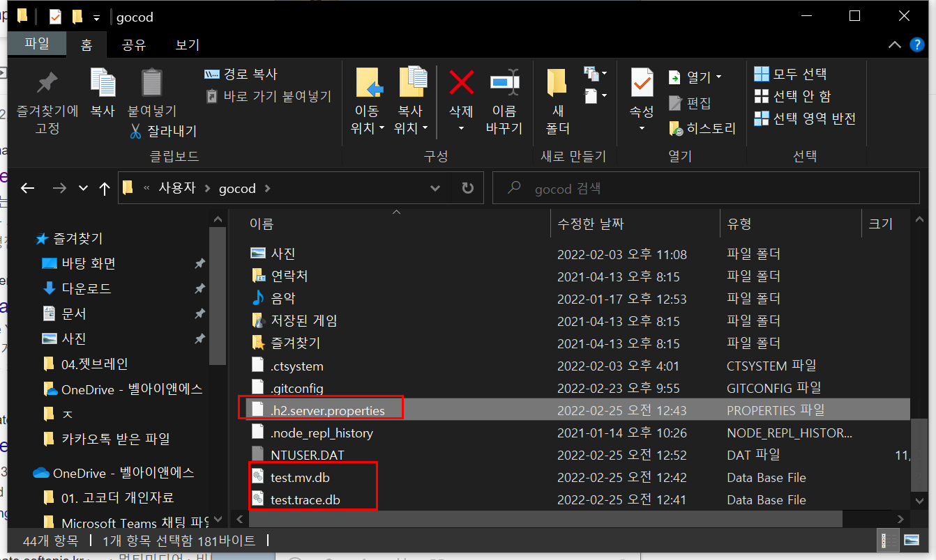 ●2. 자신의 로컬 사용자 폴더로 이동합니다. "C:\Users\사용자이름" 에서 아래에 해당하는 파일들을 수정하고 삭제합니다. 우선 삭제할 파일을 test.trace.db, test.mv.db 입니다. 해당 파일은 데이터베이스 파일입니다.