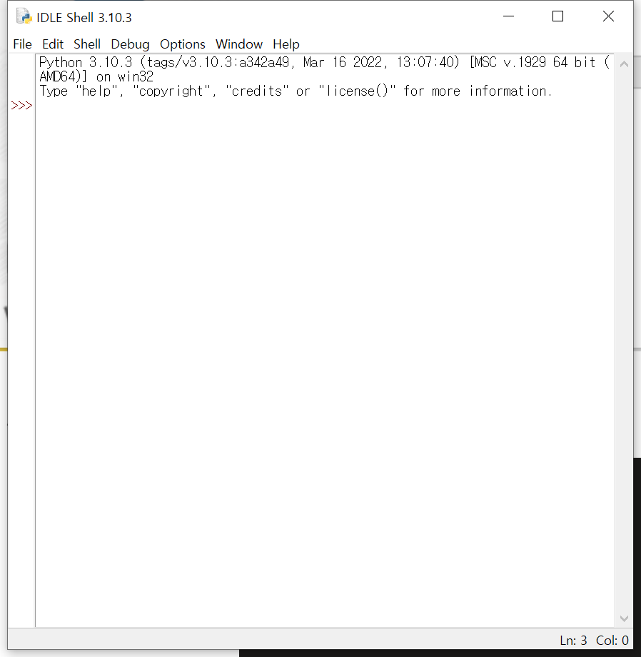 ● 5. 실행하면 아래처럼 Shell이 실행된다면 파이썬이 설치 완료되었습니다.
