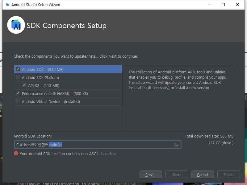 ● 2. 해결 방법은 간단합니다. 정답은 SDK 폴더 위치가 한글이 포함되면 안 됩니다. 그래서 폴더 위치를 영어로 변경했더니 아래와 같이 해당 오류가 해결되었습니다.