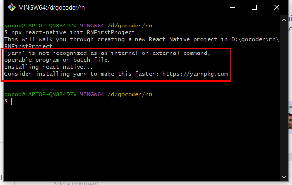 ● 1. 리액트네이티브 프로젝트를 생성할때 아래와 같은 오류가 나타난다면