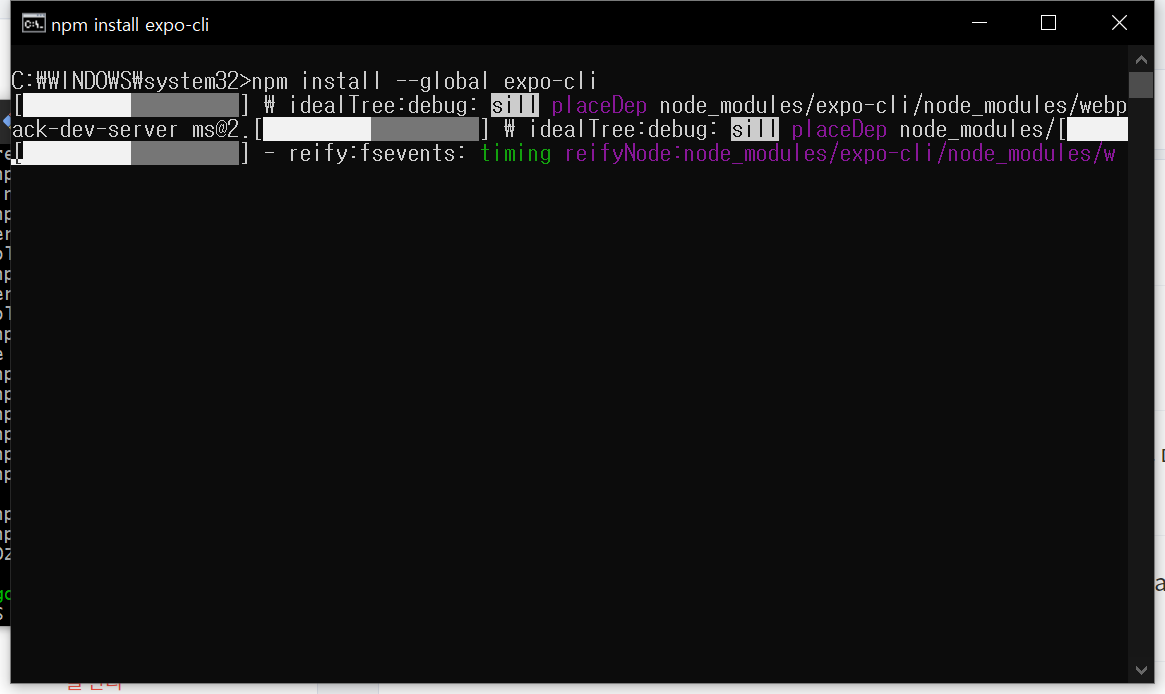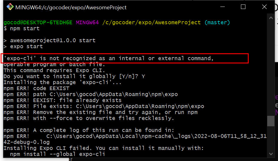● 1. expo 를 설치하던 중 아래와 같은 오류 메세지가 나타났습니다.
