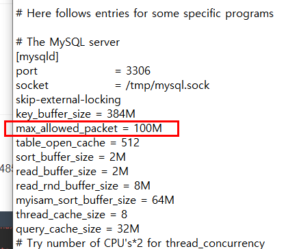● 2. mysql에 my.ini 파일에서 max_allowed_packet 용량을 늘려보세요 저는 100M가로 늘렸습니다. 그럼 정상적으로 실행 됩니다.
