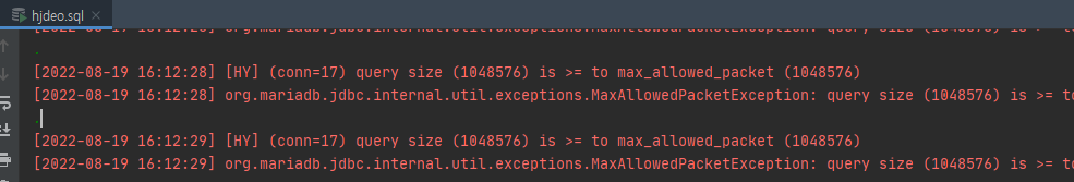 "(conn=17) query size (1048576) is >= to max_allowed_packet (1048576)"