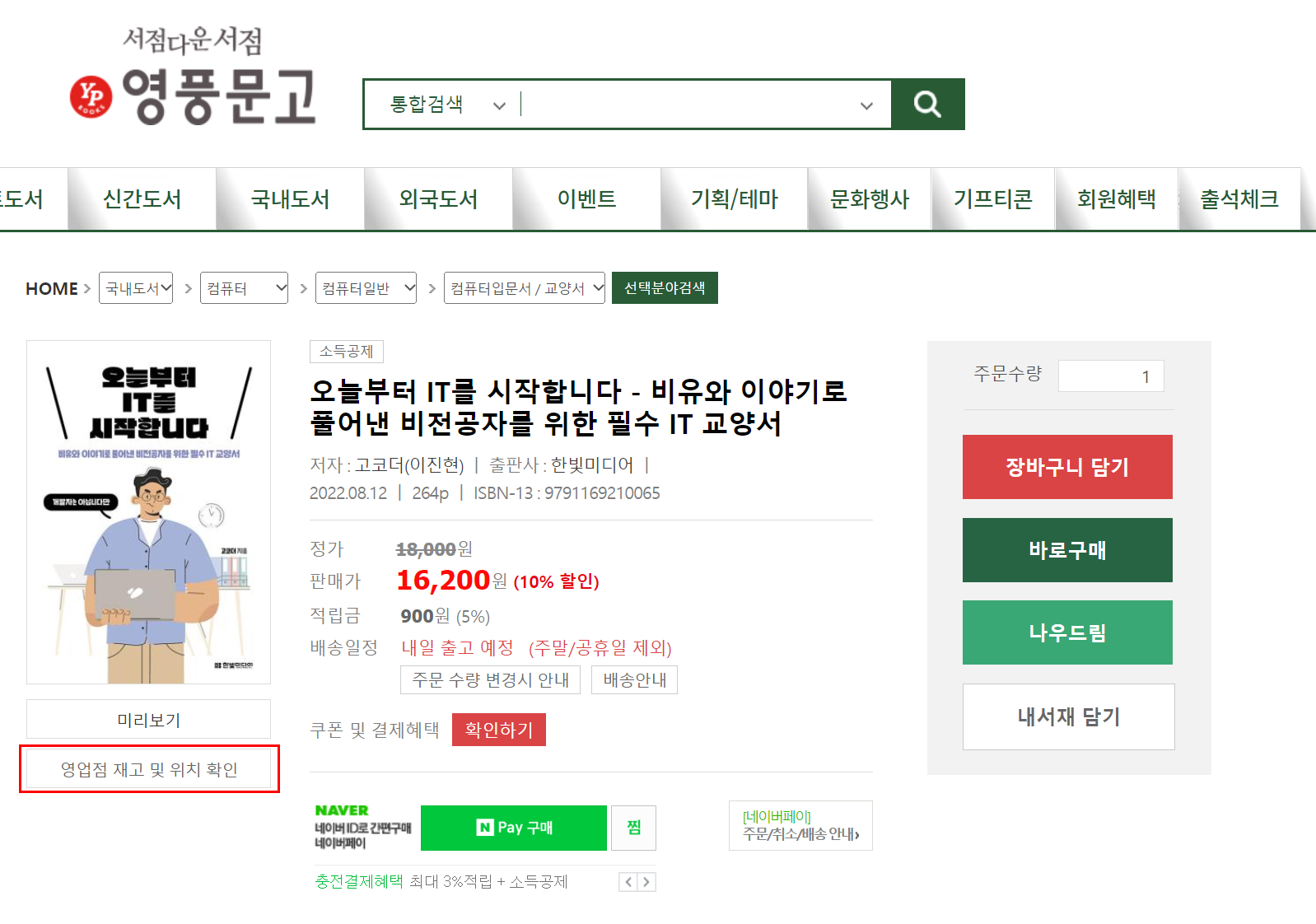 ● 1. 전국 영풍문고에서 책의 재고를 확인하는 방법을 알아보도록 하겠습니다. 우선 영풍문고를 접속하고 https://ypbooks.co.kr 재고 확인을 위해 책을 검색합니다. 그리고 상세 페이지로 이동합니다.