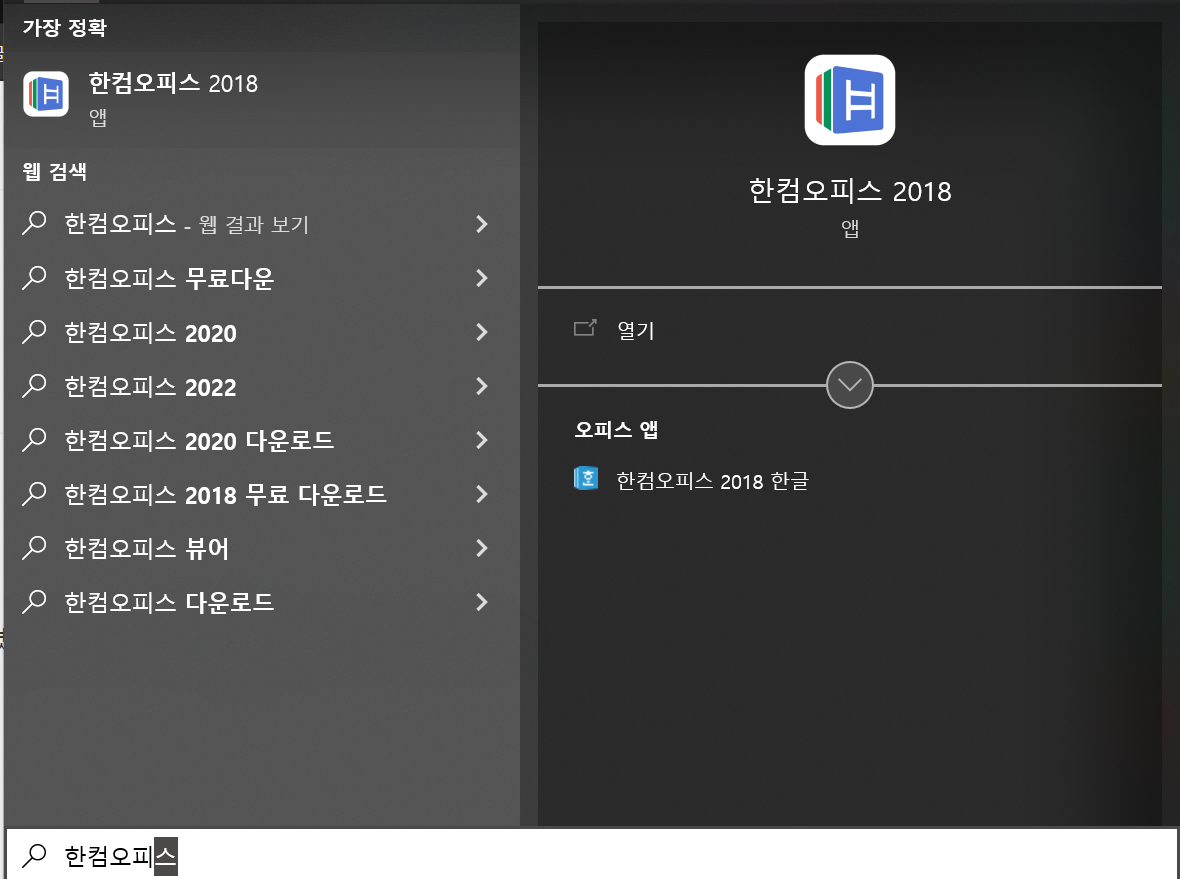 ●1. 시작에서 한컴오피스 2018을 검색해보세요. 그럼 해당 프로그램이 검색됩니다. 클릭하여 실행합니다.
