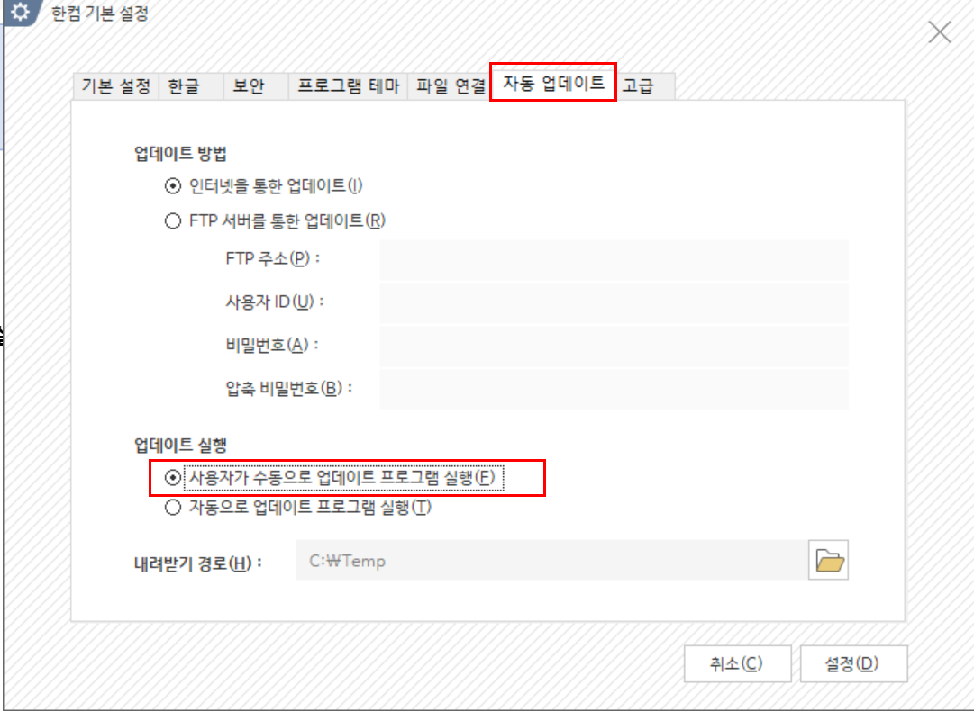 ● 4. "자동 업데이트" 탭에서 "사용자가 수동으로 업데이트 프로그램 실행"을 설정합니다.