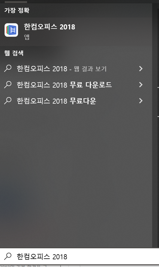 ●1. 한글 2018를 사용하실 때 업데이트를 수동으로 변경하는 방법을 알아보도록 하겠습니다. 시작에서 한컴오피스 2018을 검색해보세요. 그럼 해당 프로그램이 검색됩니다. 클릭하여 실행합니다.