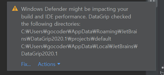 Windows Defender might be impacting your build and IDE performance. DataGrip checked the following directories