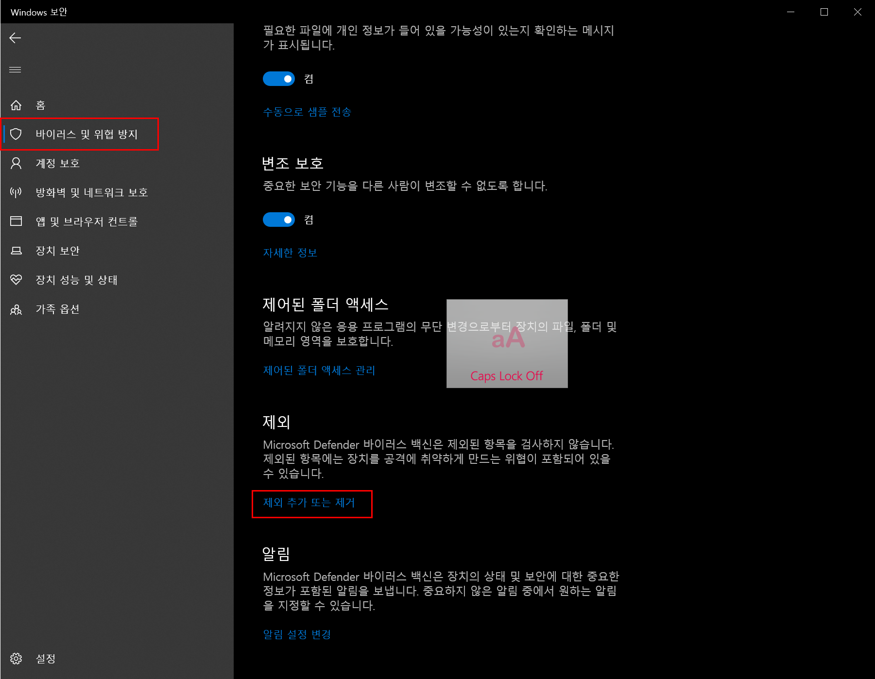 ●2. 윈도에서 기본으로 사용하는 윈도 디펜더가 제품에 영향을 끼칠 수 있다는 메시지입니다. fix를 클릭하면 제외를 해주지만 너무 자주 떠서 문제입니다. 그럴 땐 아래와 같이 설정해보세요. "바이러스 및 위협 방지" 탭으로 가셔서
