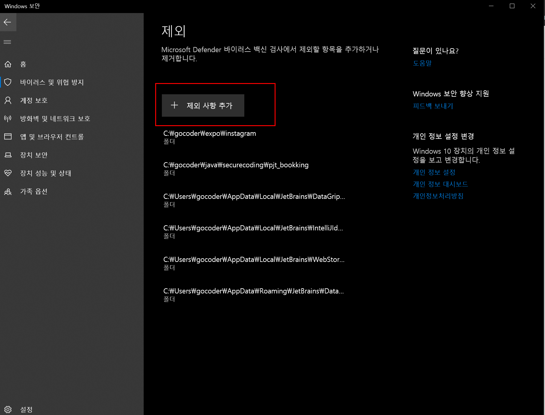 ●3. 제외 사항 추가를 클릭하여서 해당 젯브레인 제품군 폴더를 제외로 추가하면 앞으로 해당 메시지를 보지 않으실 수 있습니다.