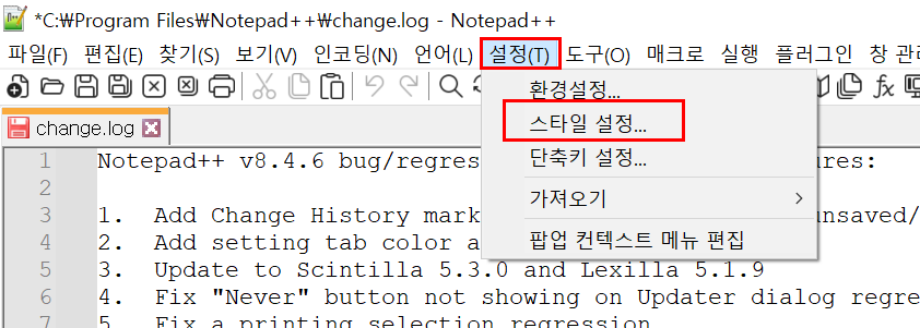 ●1. 우선 노트패드를 실행합니다. 그리고 "설정"에서 "스타일 설정"으로 이동합니다.