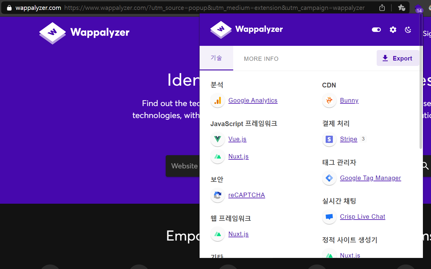 ●2. 해당 확장 프로그램을 설치하고 아이콘을 클릭하면 이렇게 해당 사이트가 사용하는 기술 및 스택을 알아낼 수 있습니다. 평소에 궁금했던 사이트 기술들을 훔쳐보세요.