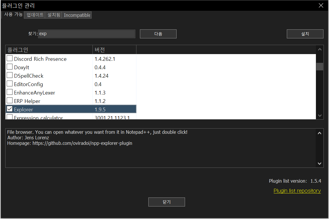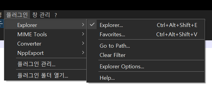 ● 1. 상단 메뉴에서 플러그인 -> 플러그인 관리를 실행하고 아래와 같이 Explorer라는 플러그인을 찾고 체크 후에 설치를 합니다.
