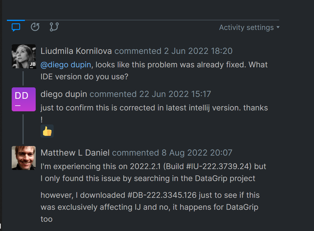 ● 2. 젯브레인 홈페이지에서 문제를 찾아보니 아래와 같은 답변이 있습니다. 해결 방법은 간단했습니다. 인텔리제이 오류로 버전을 업데이트 하면 해결이 됩니다.