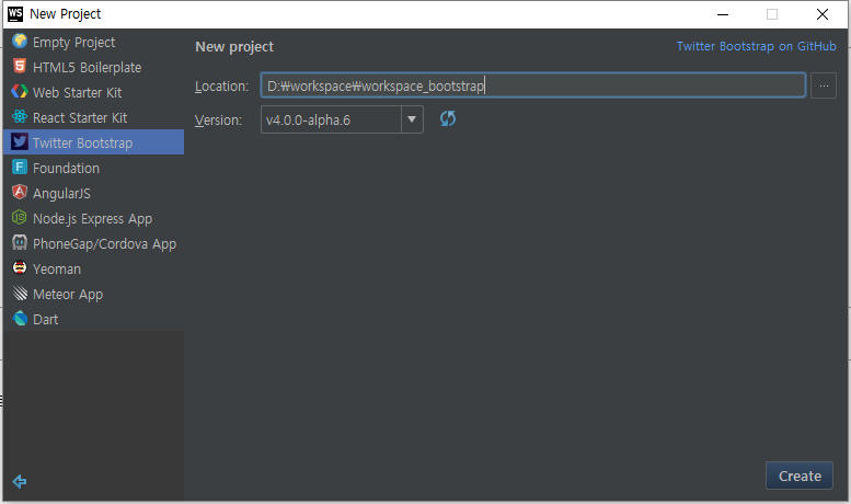 ▼ 그리고 중간에 있는 Twitter Bootstrap을 클릭합니다. 로케이션에 폴더를 지정하고 버전은 새로고침 버튼을 누르면 최신버전까지 릴리즈 되어 있습니다.